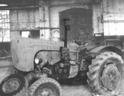 Allgaier AP 133, 33 PS, Bj. 1954 Eigentümer: Hans-Joachim Bender. Ein Fahrzeughändler führte in einer Halle 1992 einen Sonderverkauf durch. H.-J. Bender war ursprünglich dorthin gekommen, um einen Deutz F1L712 zu kaufen, der ebenfalls angeboten wurde. Per Zufall entdeckte er dabei den sehr heruntergekommenen A 133 und entschloß sich, aufgrund des mit 250 DM niedrig angesetzten Preises spontan, den nicht fahrbereiten Traktor zu erwerben, der schließlich sogar für nur 180 DM in sein Eigentum überging. Alle Blechteile sind extrem stark vom Rost befallen, bis auf einen Vorderreifen waren alle Reifen total defekt und die Hinterradfelgen aufgrund von Durchrostungen unbrauchbar. Der Motor konnte zwar wiederbelebt werden, verlangt aber auch nach einer gründlichen Gesamt-Überholung. Das Foto zeigt den Allgaier noch 1992 in der Halle des Fahrzeughändlers, kurz vor seiner Abholung. |