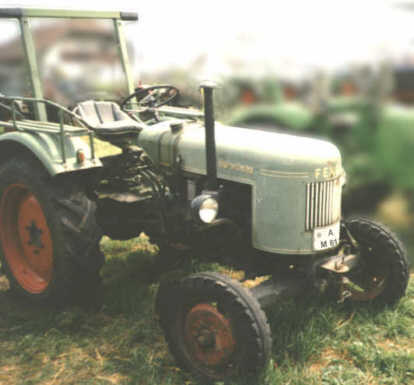 FENDT F 24 W, 24 PS, Bj. 1953 Eigentümer: Siegfried Reichert. Beim Besuch eines Oldtimer - Traktortreffens hörte Siegrfried Reichert davon, dass in einem alten, halb verfallenen Schuppen in der Nähe, seit über 10 Jahren mehrere alte Traktoren vor sich hin gammeln würden. Kurzerhand beschloß man, einen Abstecher, zu dem Schuppen zu machen. Tatsächlich befanden sich darin 13 alte Traktoren, die größtenteils in einem desolaten Zustand waren. Der einzige Traktor, der noch recht gut aussah, war dieser Fendt. Der damalige Besitzer wurde in der Nachbarschaft schnell ermittelt, ein alter Herr, der begeistert war, als er hörte, dass jemand den Schlepper zum Restaurieren und nicht zum Verschrotten haben möchte. So wechselte der F 24, der sich übrigens als betriebsfähig entpuppte, noch am gleichen Tag den Besitzer, ebenso 4 weitere Fendt - Schlepper aus dem Schuppen. Er wurde sofort aus eigener Kraft zum Treffen gefahren und abends von dort aus in sein neues Zuhause. |