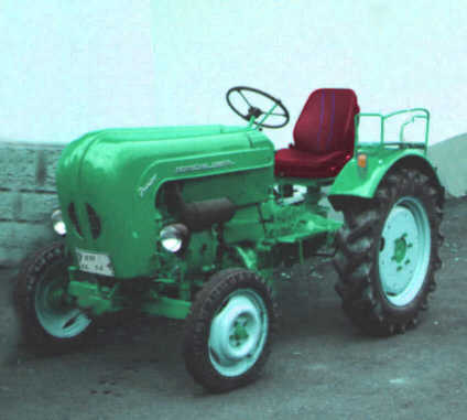 PORSCHE - Diesel - Junior, 14 PS, Bj. 1958 Eigentümer: Paul Faßhold. Auf einem Campingplatz wurde dieser Porsche 1998 entdeckt. Der Campingplatzbesitzer hatte ihn erst 1997 komplett restauriert. Er wählte dabei den für Porsche eher ungewöhlichen Farbton, weil der Traktor zuvor bereits so lackiert war. Da der Campingplatzbesitzer sich 1998 aber einen großen Hanomag R 460 zulegte, verkaufte er den frisch restaurierten Junior kurzerhand an Paul Faßhold, der sich schon seit seiner Jugend sehr für Porsche - Schlepper begeisterte, aber nie einen passenden, relativ kompakten Schlepper dieser Marke fand, den man noch gut in der normalen PKW-Garage einer Wohnsiedlung unterbringen konnte. Trotz gelegentlicher Kritik will Paul Faßhold den Farbton keinesfalls verändern, da die Restaurierung fachlich sehr gut gelungen ist und dadurch nur Schaden nehmen würde. |
